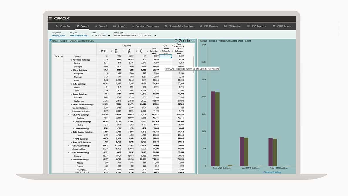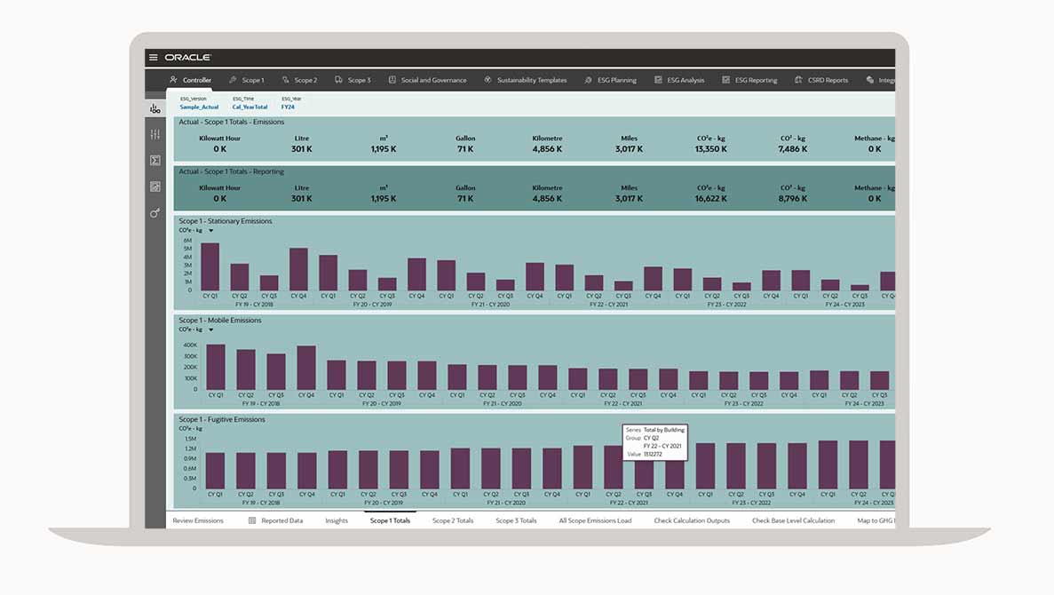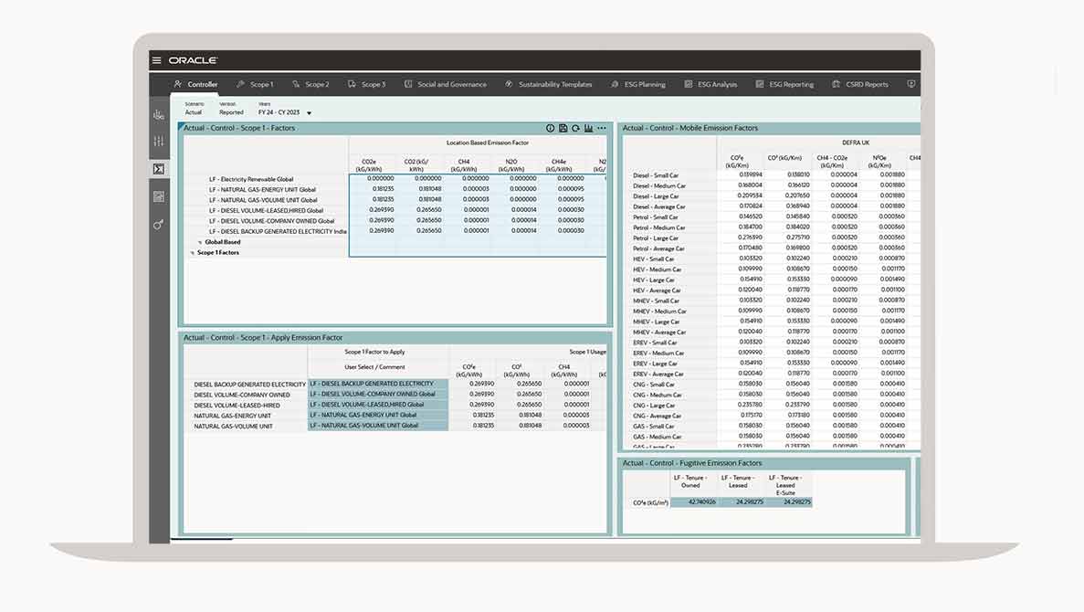 Oracle Cloud EPM allows flexible mapping for scope 1, 2, and 3 activities (GHG Protocol Corporate Standard), linking data to adjustable emission factors for carbon accounting calculations. The emissions calculator then automates all unit conversions and calculations.
