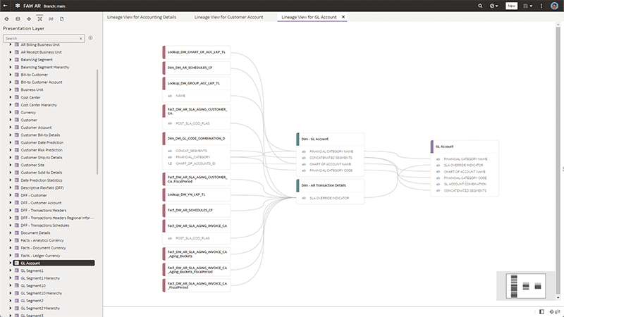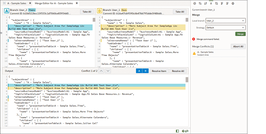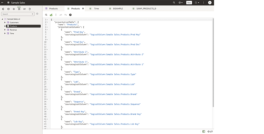 The semantic modeler integrates with any Git-compatible repository, such as GitHub, GitLab, or Git on Oracle Visual Builder, to provide a seamless, collaborative, multi-user development environment and source control. Git integration for multi-user development supports branching, merging, pull and push operations, and enables full visibility into the development lifecycle of the semantic model.