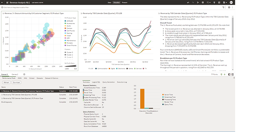 With developer mode, analysts and developers can monitor the performance of individual visualizations or a complete canvas. This allows them to find any objects that are underperforming, identify any issues, and correct them. Developers can examine logical SQL created for analyses, observe which queries are generated, and see the execution log.