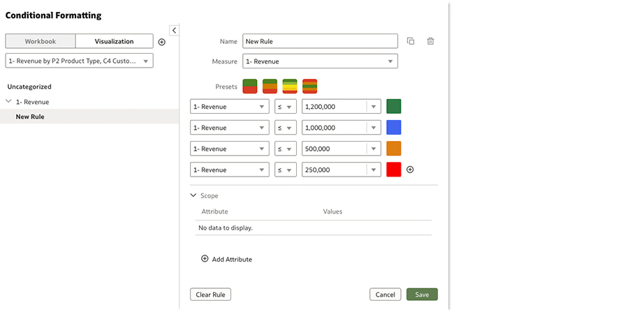Set conditional formatting rules for reports, visualizations, tables, and pivot tables. Rules can be applied to a specific chart, all charts on a page, or a specific metric. Use the sophisticated rules engine to express complex formatting logic.
