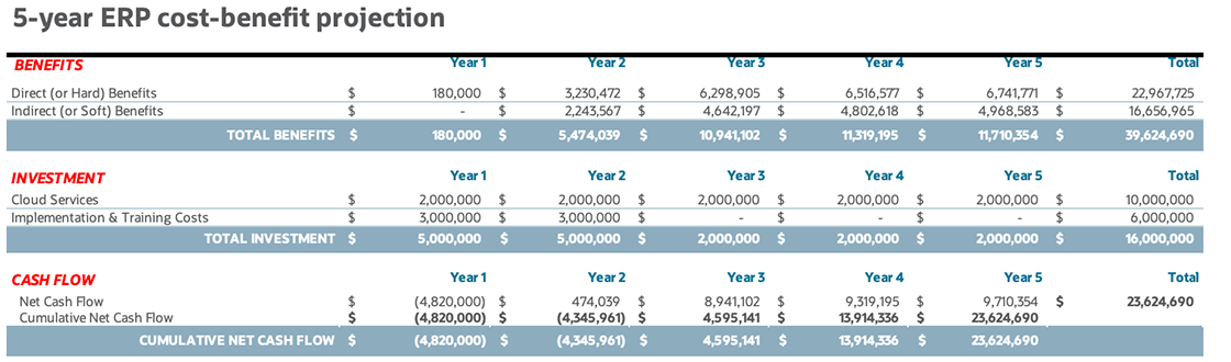 To determine if a new ERP is the right decision, you want to provide a detailed analysis of the potential return on investment (ROI). Typically, this analysis is based on comparing gains—such as increased revenue, better cash flow, increased staff productivity, lower capital costs, and lower support costs—against the implementation and ongoing subscription costs. It will compare the new system’s total cost of ownership versus the cost of keeping and maintaining the existing system. It usually leans heavily on industry benchmarks, analyst studies, and business process maturity models to assess a range of conservative and likely models for the returns and costs. The plan also should provide an estimated timeframe for how soon the new system will be in place and when expected benefits will be achieved. You want stakeholders to understand what success looks like and how you’ll measure that success going forward.