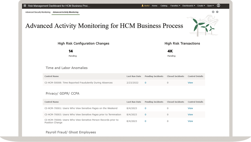 Monitor user access and activity across the hire-to-retire process. Enforce separation of duties and analyze all payroll runs, compensation changes, and time card transactions.
