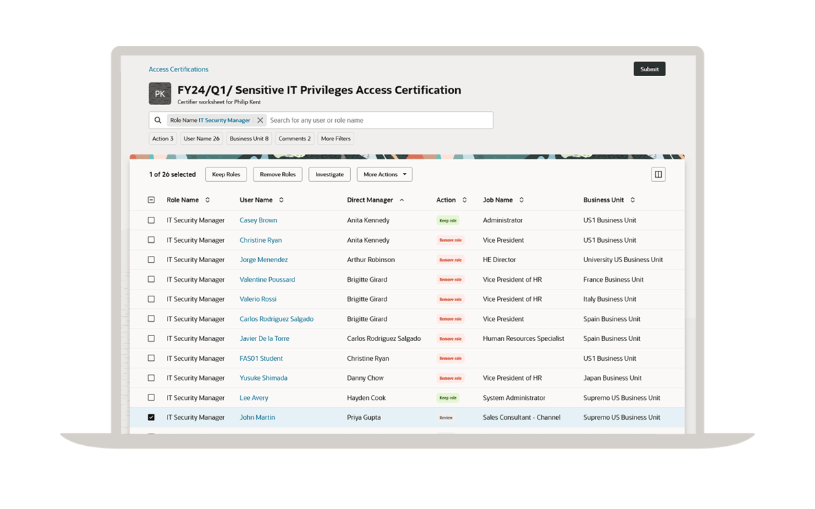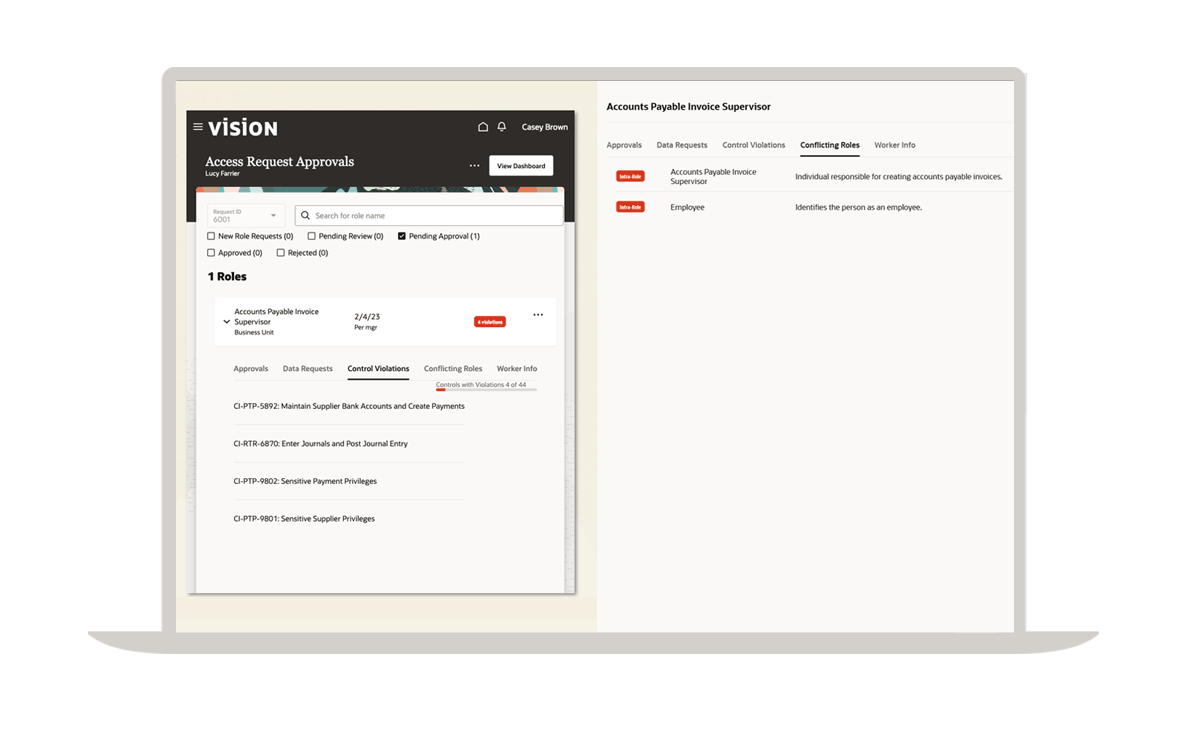 Enable self-service user access requests and help prevent SoD conflicts prior to provisioning access. Route access requests to business process owners for review, document exceptions, and grant access if approved.