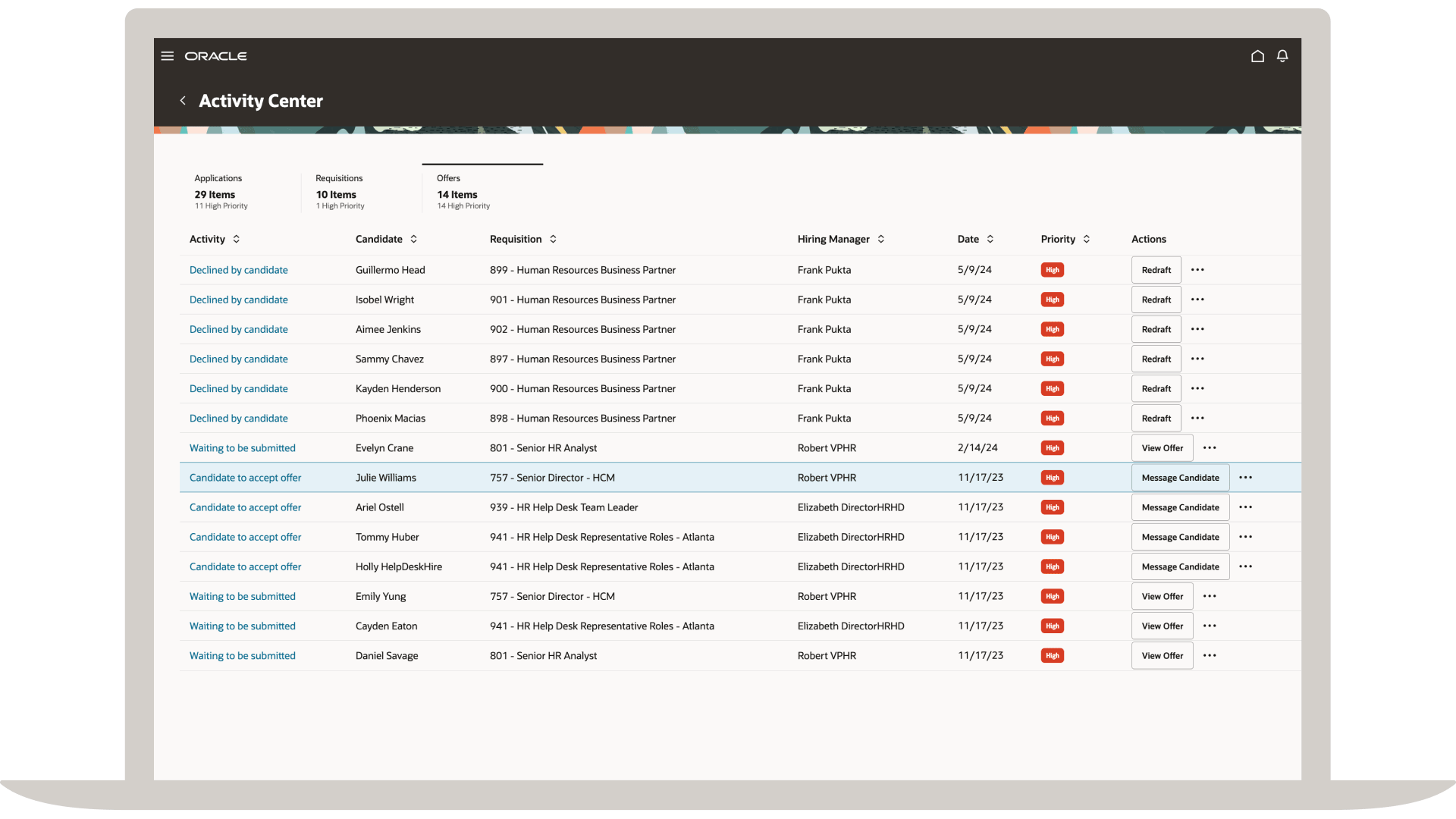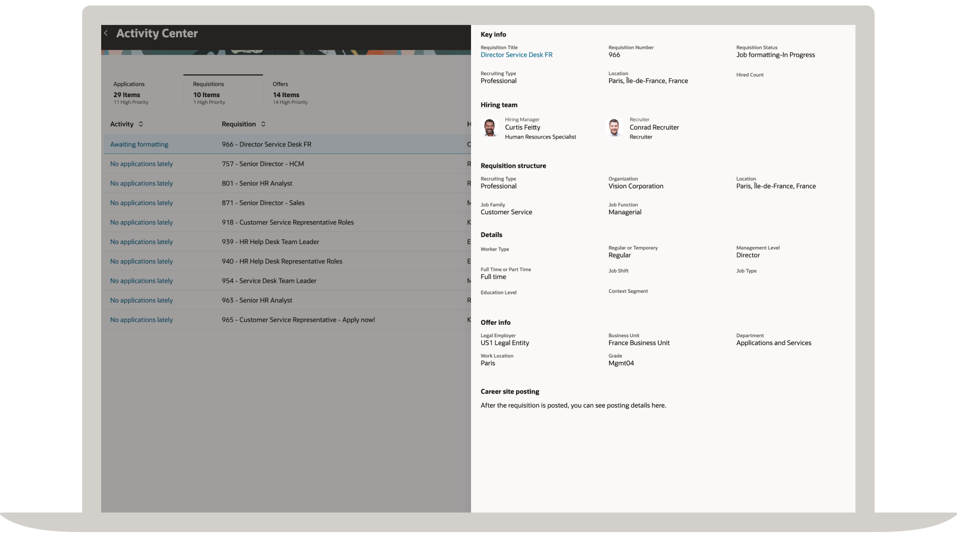 Have a single work area to complete activities for job requisitions, job applications, and job offers.