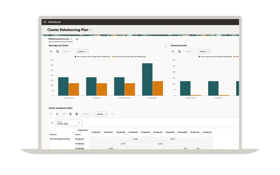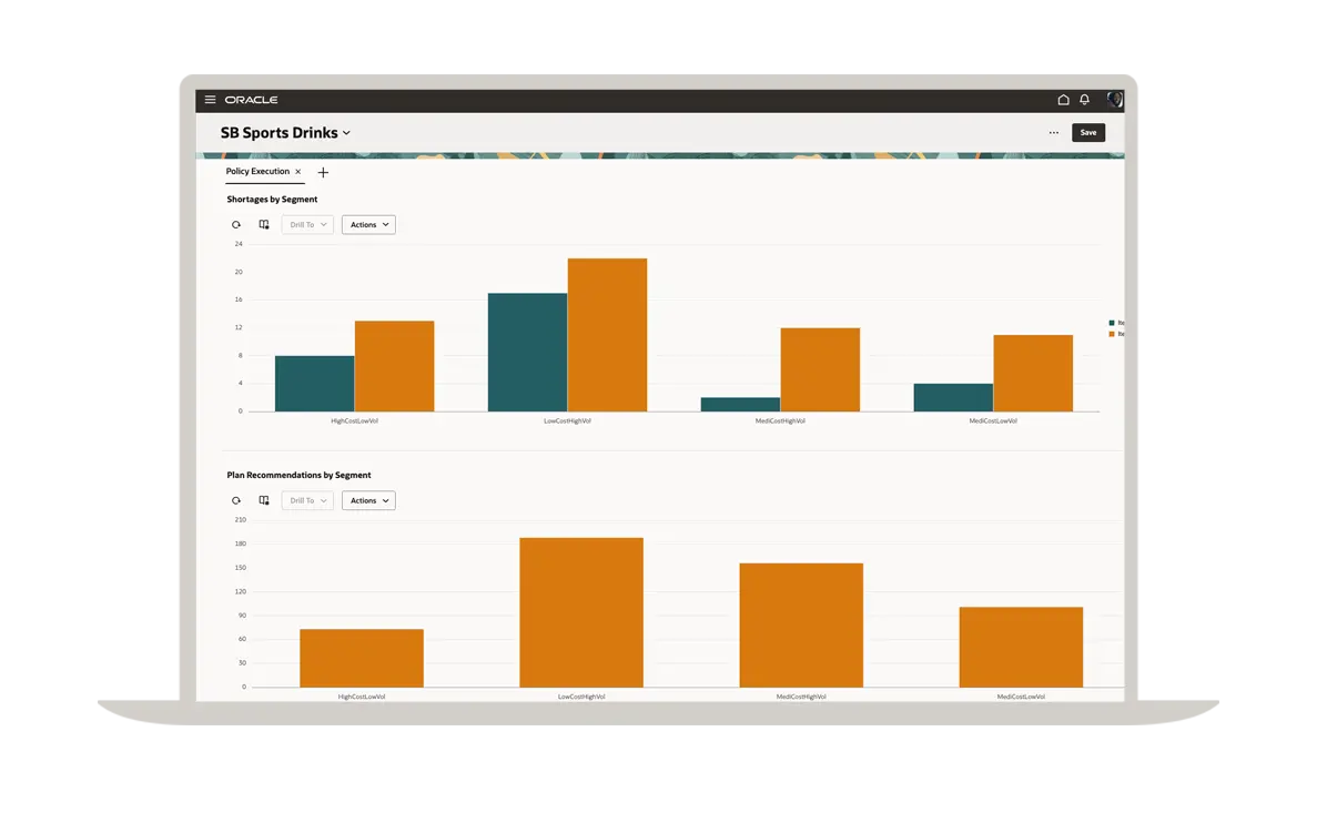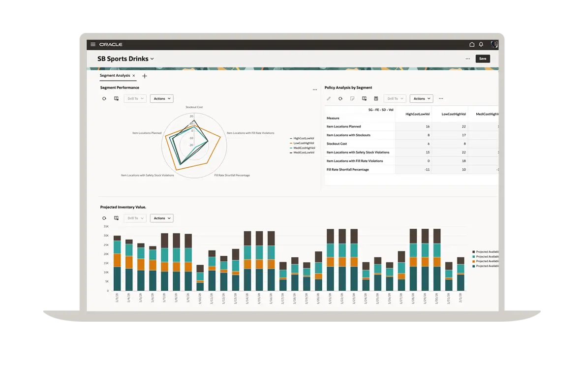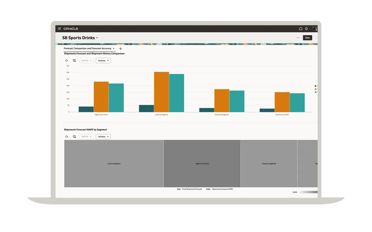 An effective replenishment plan starts with an accurate demand forecast. With Oracle Demand Management, you get the capabilities of a world-class demand planning solution, so you can easily manage new item launches, low-volume products, seasonality, and one-time events. Here you can see a comparison of shipment forecasts with shipment histories across various segments.