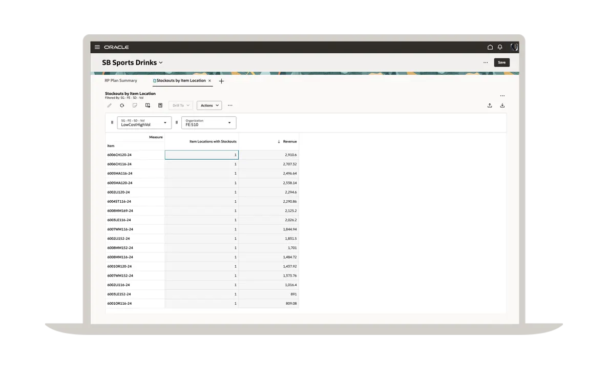 Quickly identify the specific items and locations that are performing poorly. Here you can see the fill rate shortfall percentages in decreasing order. This enables you to review the fill rate shortfall percentages for low-cost, high-volume items in a particular facility. You can click on any item to drill down to a workbench where you can address the issue.