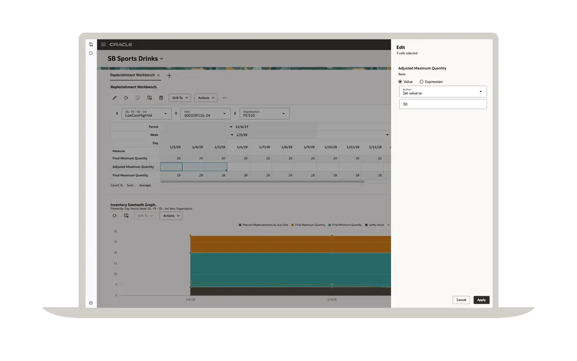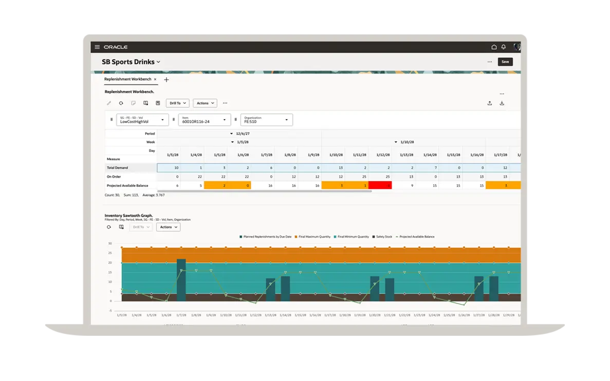 The replenishment planning workbench gives you a time-phased view of demand, supply, and planned replenishments, along with min-max inventory and safety stock thresholds. In this case, the maximum inventory threshold is too low to meet an upcoming demand spike, potentially triggering stockouts on 1/12 and 1/19.