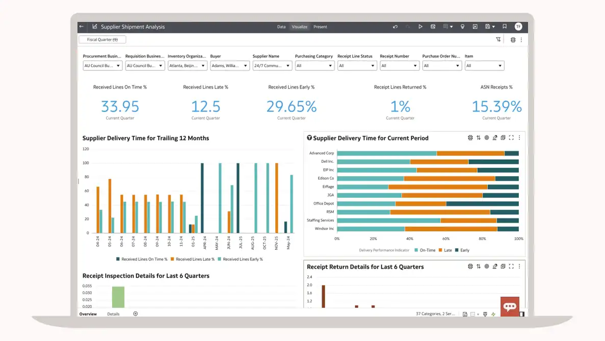 Visualize the overall performance of your global supply chain in Oracle Fusion Analytics Warehouse.