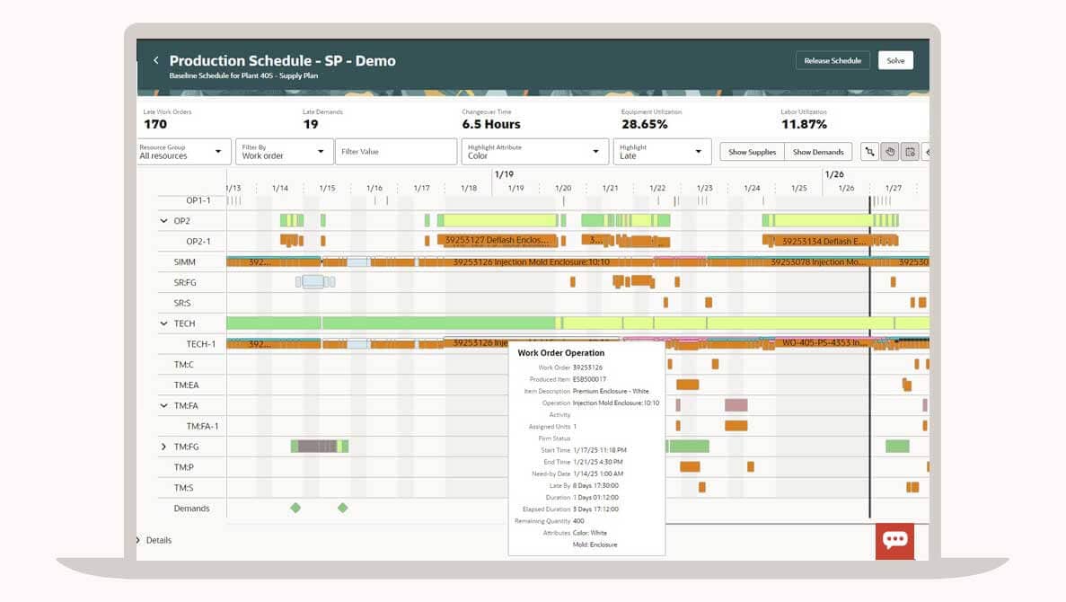 Get at-a-glance aggregate and detailed summaries of revenue, margin, demand, supply, resource utilization, changeover time, and other metrics.