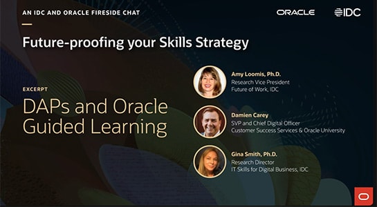 Join IDC analysts Amy Loomis and Gina Smith for a fireside chat with Damien Carey, chief digital officer for Oracle Customer Success Services, as they share their perspectives on future-proofing your organization’s skills strategy with digital adoption platforms (DAPs) and explore their strategic and growing importance and use cases.