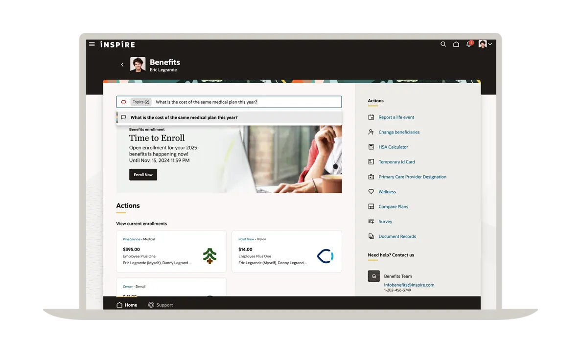 Ask for help from an AI agent directly embedded in the benefits enrollment process. The agent can answer coverage questions, provide cost guidance, offer personalized plan recommendations, and more.