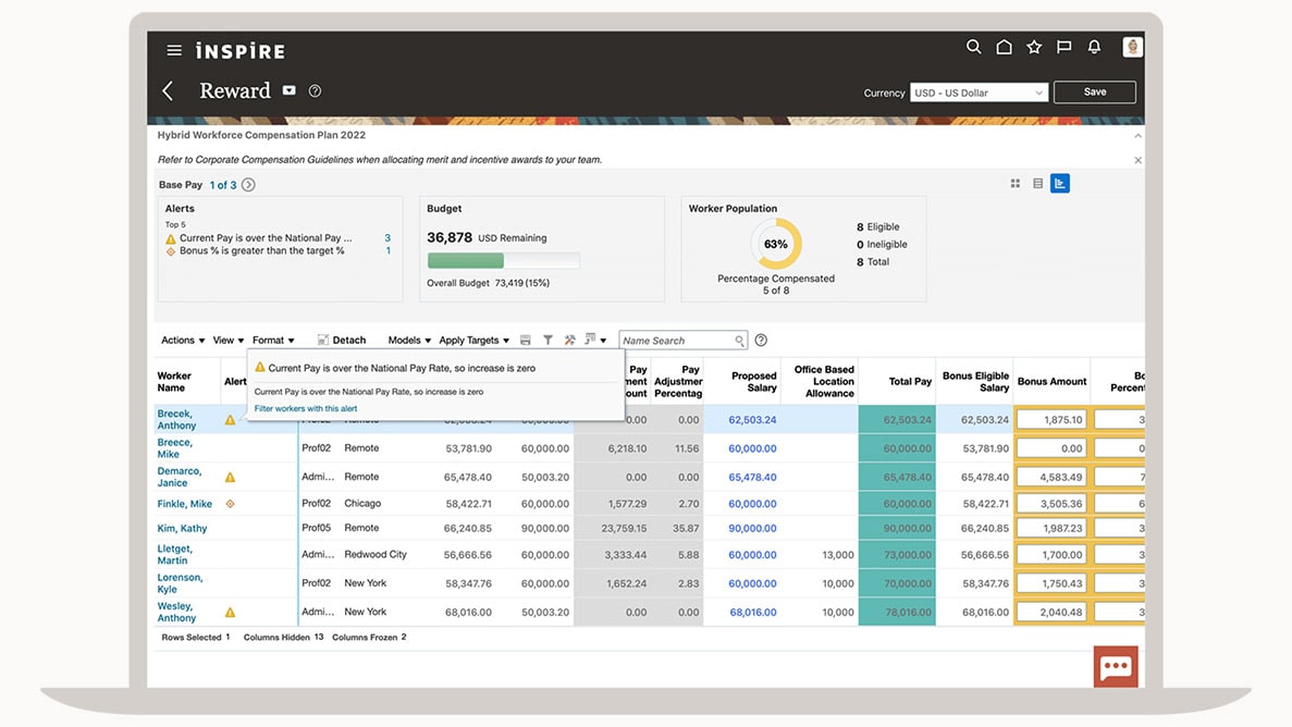 Support pay equity and fair compensation by providing managers with a view of national pay rates, the location allowance, and the recommended or enforced target bonus for each employee. Notify managers when compensation is out of range or when performance is low.