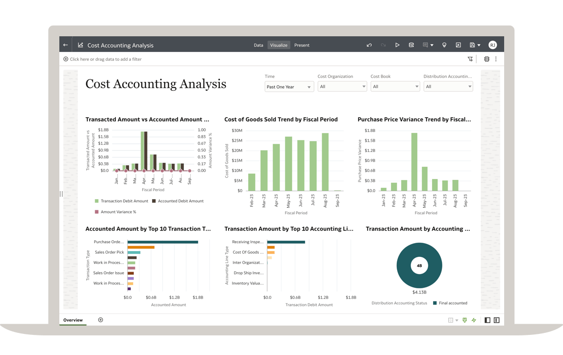 Analyze cost distribution for a cost organization and cost book by period, transaction type, accounting line type, and items. Get insights such as purchase price variance at different levels of granularity.