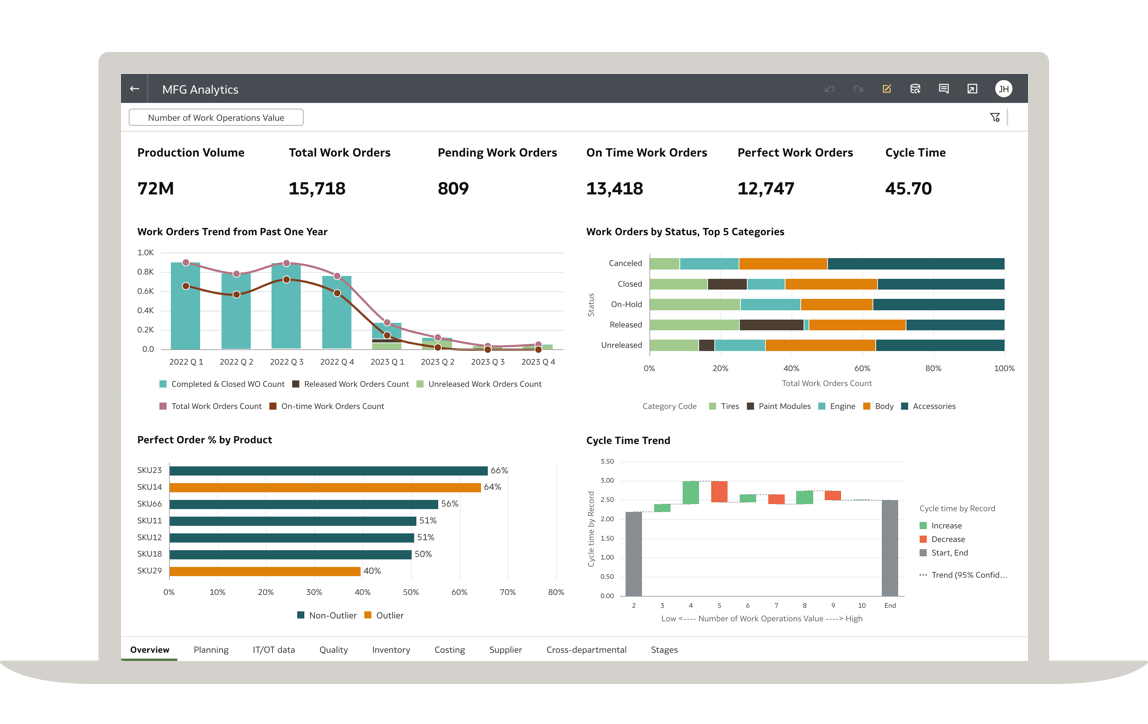 Leverage ready-to-use key performance indicators (KPIs) to track work order execution. Discern patterns and bottlenecks across manufacturing stages to pinpoint the root causes behind deviations that influence overall output quality.