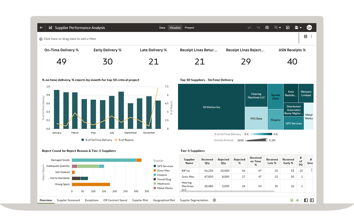 Analyze supplier performance against contractual obligations using prebuilt metrics, such as on-time delivery, rejected shipments, and return rates. Quickly identify the root cause of poor supplier performance and take corrective action to minimize risk and supply chain disruptions.