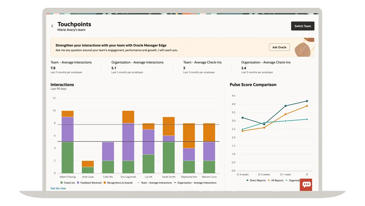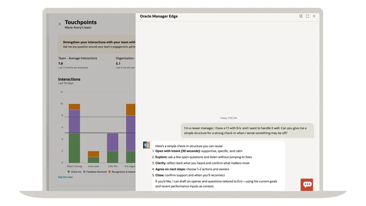 Oracle Touchpoints is an AI-powered, continuous employee engagement solution that uses signals from across Oracle Fusion Cloud HCM to help managers coach better and build leadership skills while giving employees an easy way to get support for goals and growth.