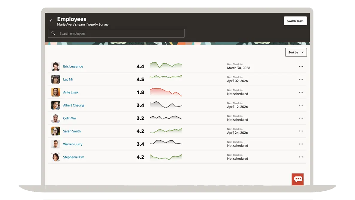 Make it easy for managers to view team trends and let them drill into an employee’s check-in responses to prep for one-on-one conversations and coaching.