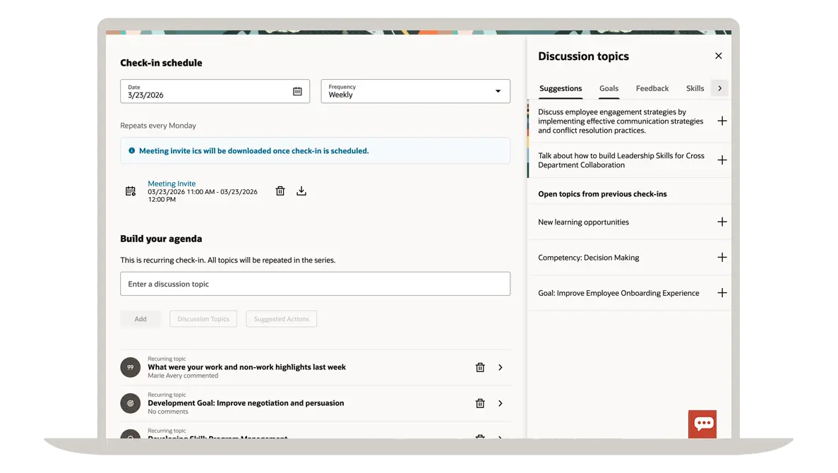 Use signals from across Oracle Cloud HCM to support continuous manager-employee conversations. Help managers coach better and build leadership skills while giving employees a simple way to ask for support with performance and growth.