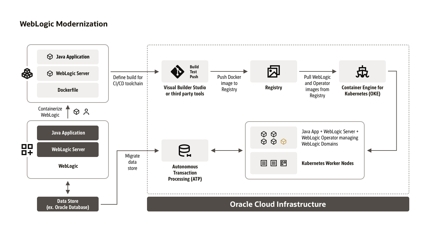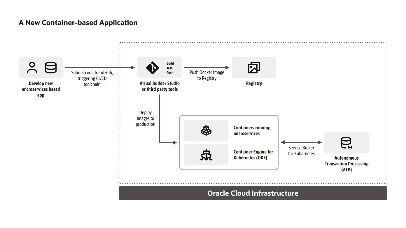 Oracle Container Engine for Kubernetes(OKE)、Oracle Visual Builder Studio、およびOracle Autonomous Transaction ProcessingでこのDockerレジストリを使用することで、クラウド・ネイティブ・アプリケーションを導入します。