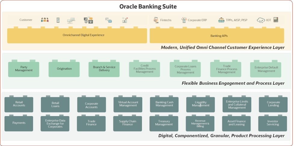 リテール・バンキング向けには、このスイートは、顧客の獲得、サービスデリバリー、延滞管理といった個々のビジネス機能にわたるビルディング・ブロックを提供します。コーポレート・バンキングの場合、銀行は、法人口座、法人融資、資金管理、流動性管理、貿易金融、サプライチェーン・ファイナンス、財務管理など、さまざまなビジネス・ラインで構成可能なブロックを活用できます。