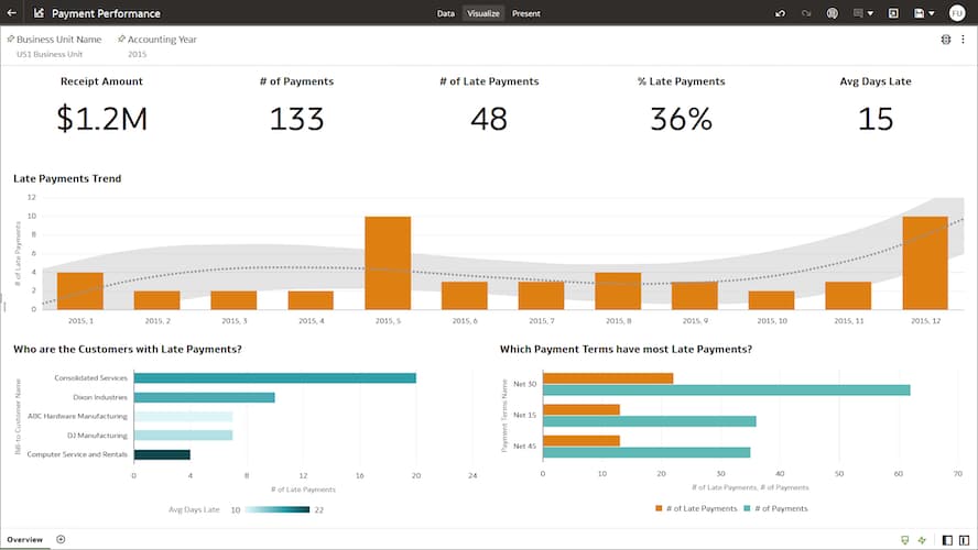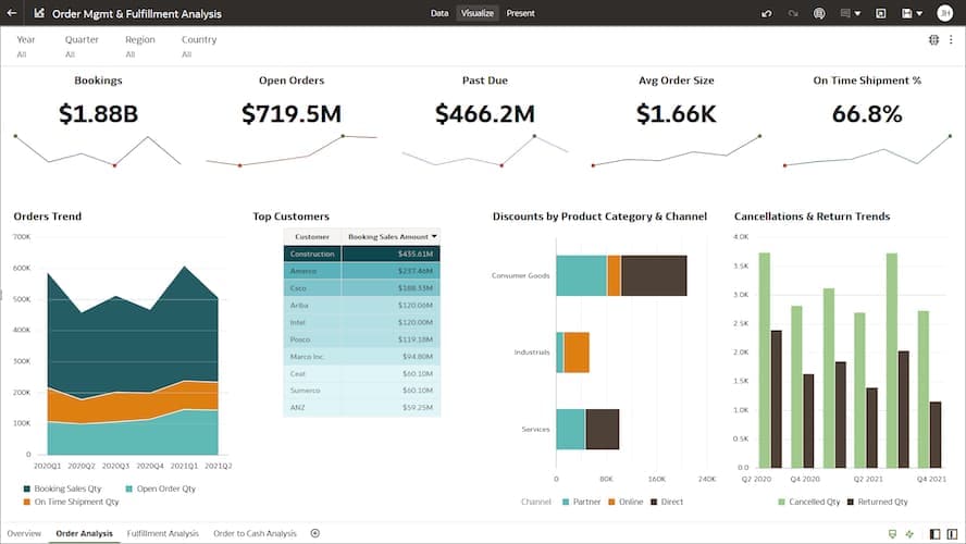 Oracle Fusion Analyticsには、チームが特定の組織目標に対してパフォーマンスを監視できるようにする、ベストプラクティスの主要業績指標(KPI)のライブラリが含まれています。
