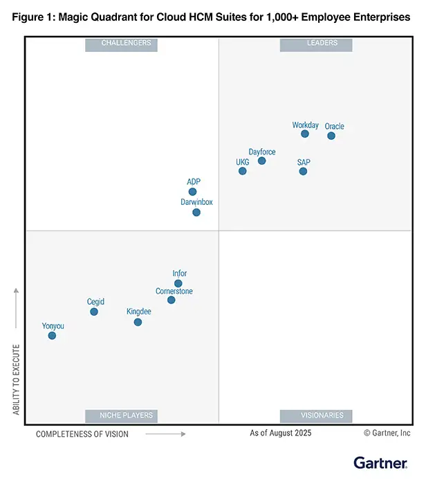 *Gartner、『Magic Quadrant for Cloud HCM Suites for 1,000+ Employee Enterprises』、2025年9月8日発行アナリスト: Josie Xing、Ranadip Chandra、Sam Grinter、Ron Hanscome、Harsh Kundulli、David Bobo、Chris Pang、Anand Chouksey、Laura Gardiner、Jackie Watrous、Stephanie Clement、Michelle Shapiro、Chris Hester、Jeff Freyermuth