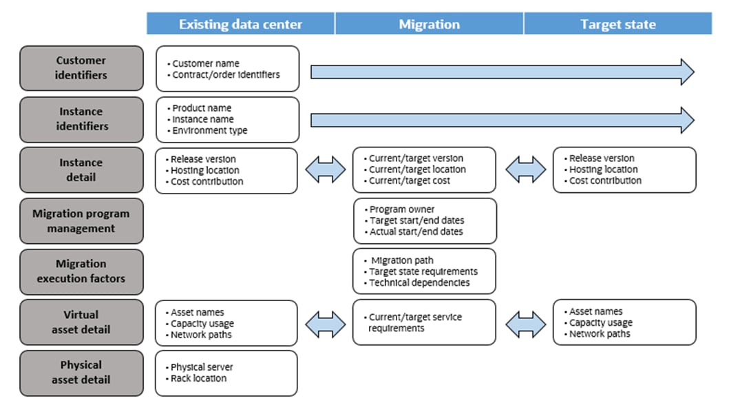 移行インベントリの管理は、それ自体が機能横断的なプロジェクトであり、詳細なデータの必要性と収集作業のバランスを取る必要があります。また、詳細な技術仕様、アーキテクチャ的アプローチ、顧客要件、データ転送経路など、時期とスピードに影響を与える依存関係、制約およびリソースを示す要素も含まれています。情報が少なすぎると、インベントリは役に立ちません。多すぎると、メンテナンスが負担になり、すぐに古くなって使用されなくなる可能性があります。