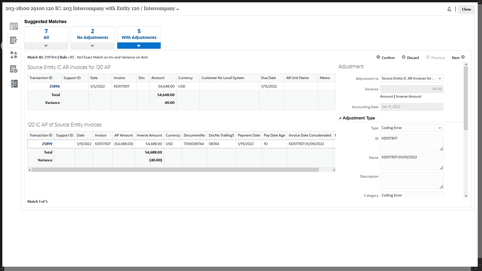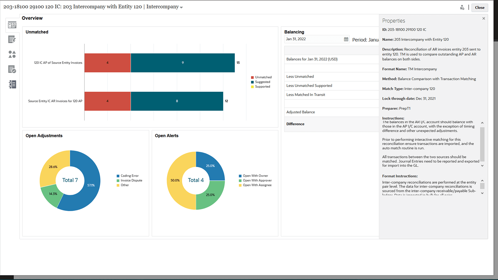 トランザクション量が多く、労働集約的な調整には、高度なトランザクション照合機能が必要です。自動照合エンジンは、数百万のトランザクションを数分で照合できます。これは、ある時点での調整の証拠を提供し、コンプライアンス要件を満たすために、期末調整に緊密に統合されています。