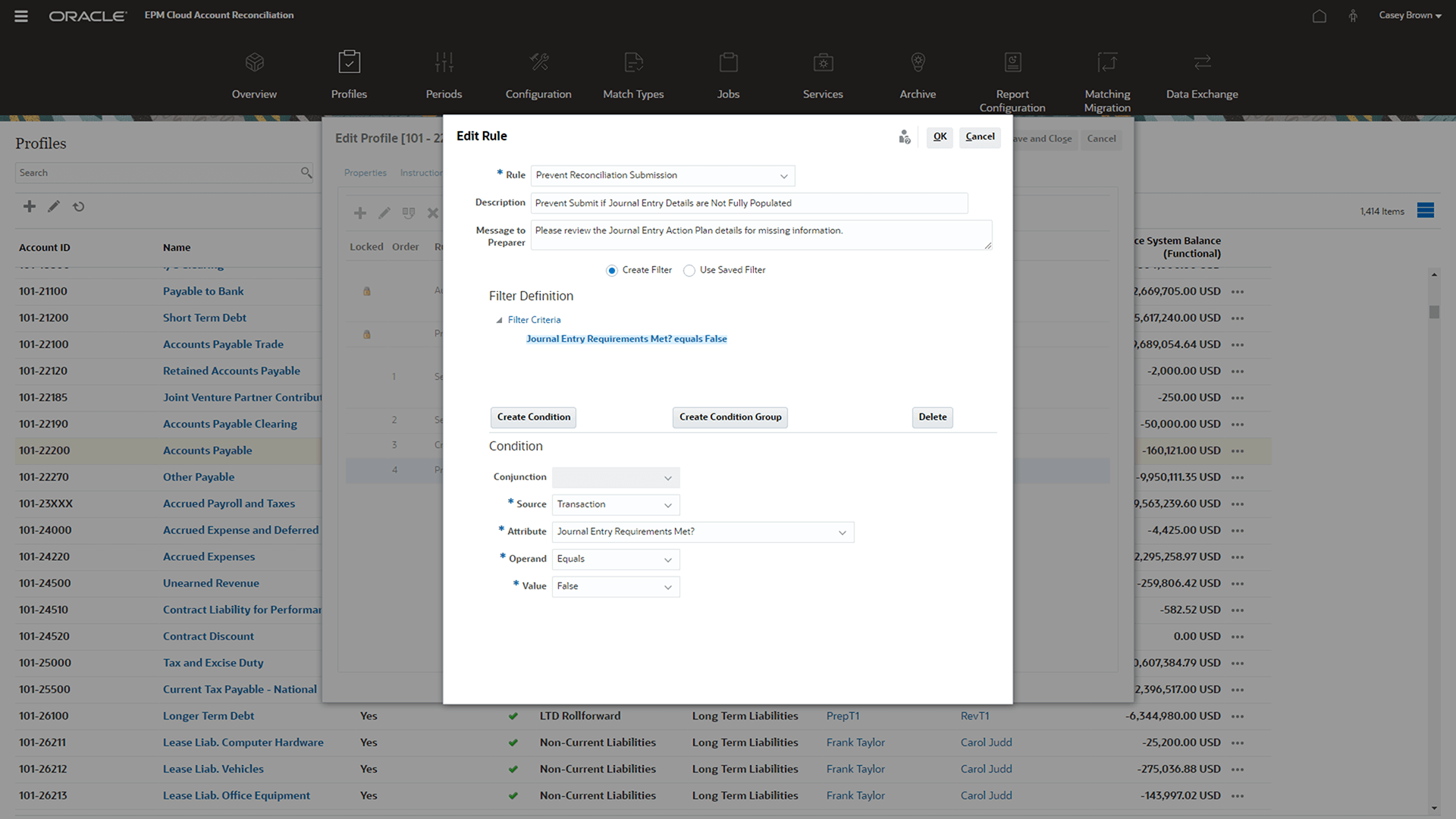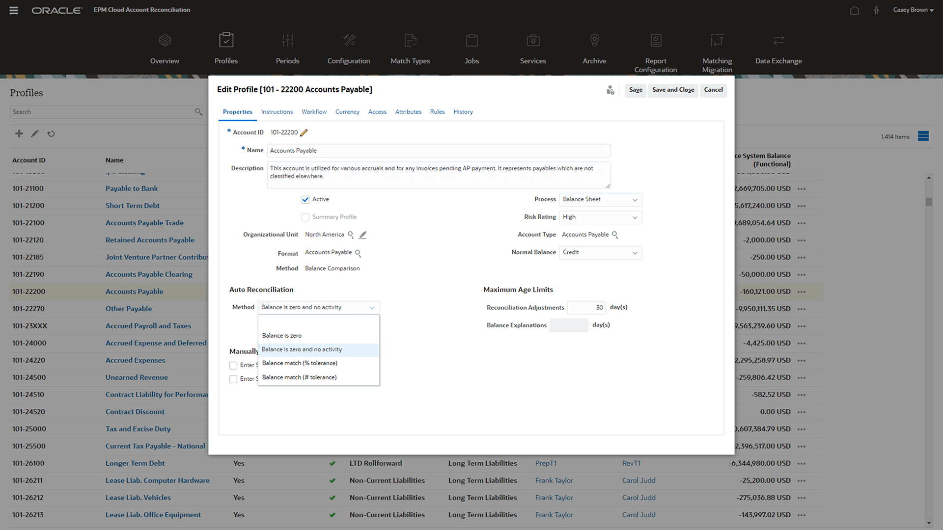 アカウントごとに、リスク評価、ワークフローの割り当て、使用する通貨、および自動調整と差異の処理に使用するルールを含むプロファイルを作成します。カスタムVBスクリプトやカスタム・コードは必要ありません。ポイントアンドクリックするだけです。