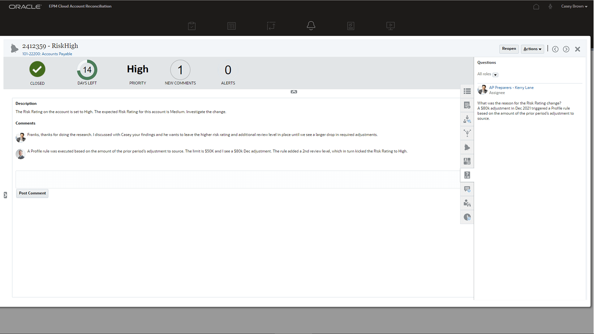 手動または自動でアラートを生成して例外管理を行い、円滑な決算のためにすべての問題が割り当てられ、追跡され、削除されることを確認します。