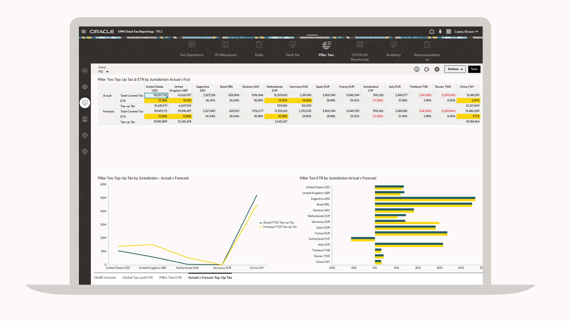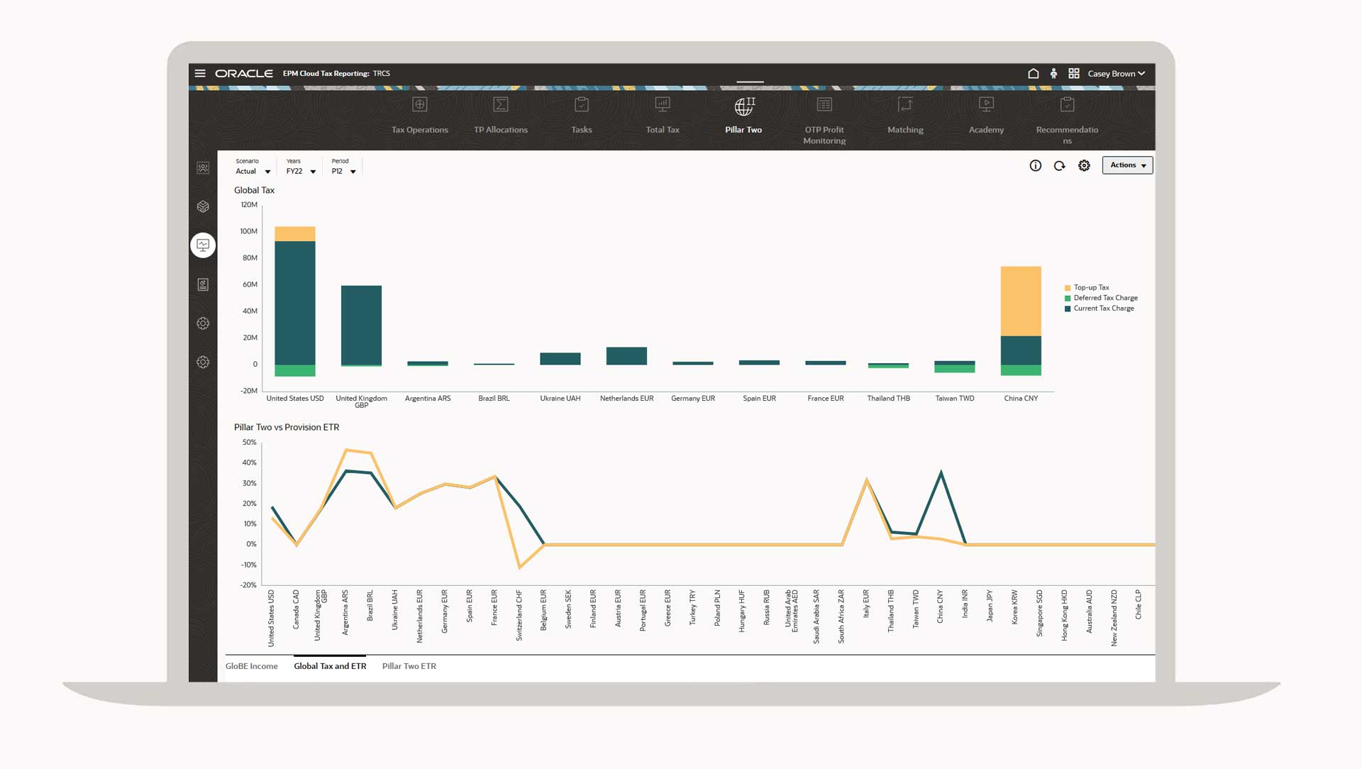 Oracle Cloud EPM Tax Reportingは、OECDの第2の柱(グローバル・ミニマム課税)レポート向けにエンドツーエンドの機能を提供します。これらのソリューションには、自動化された上乗せ税計算、さまざまなソース・システムからの効率的なデータ収集、第2の柱業務の容易なモニタリング、第2の柱が将来組織に及ぼす影響のモデリングなどが含まれます。