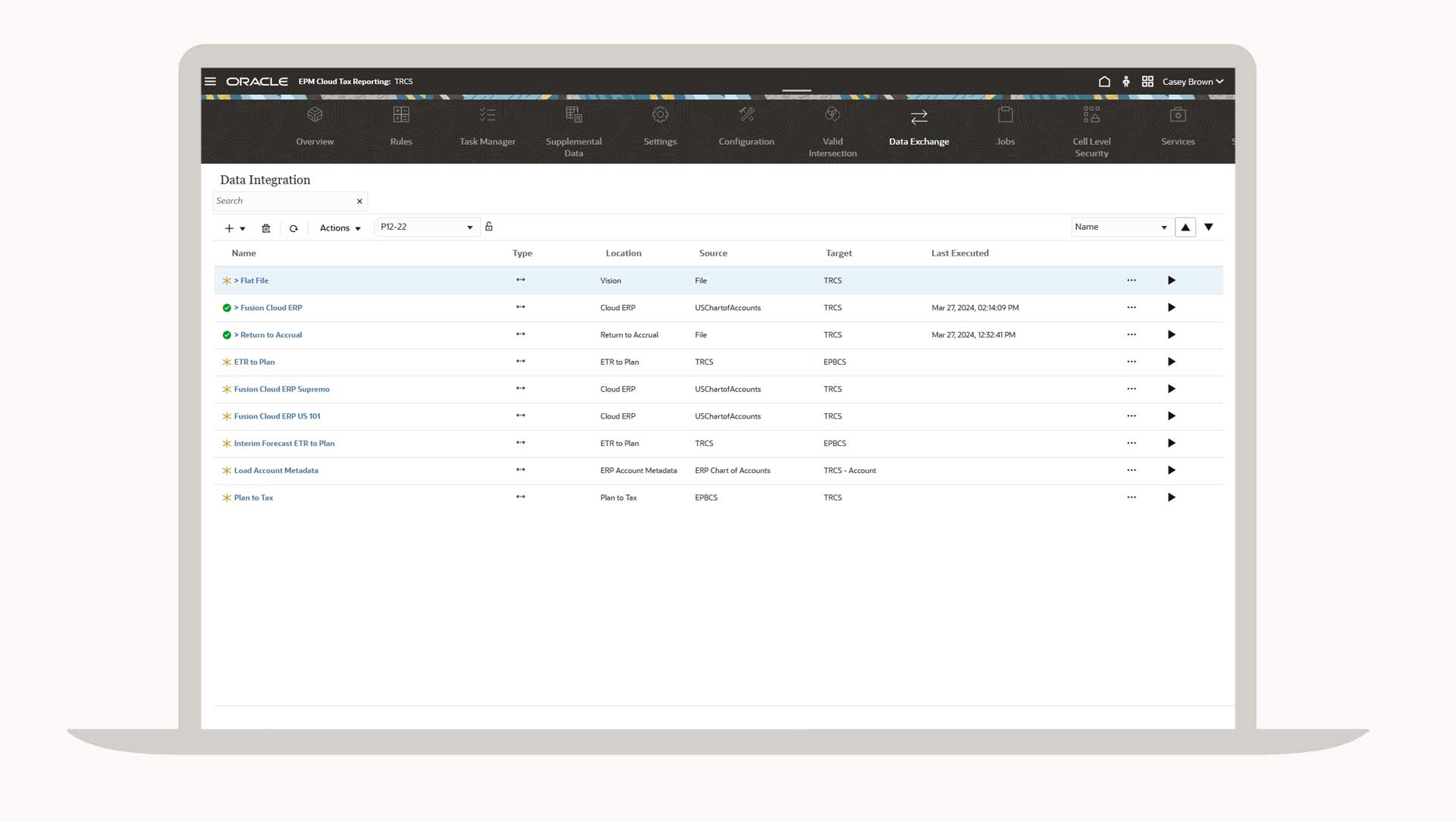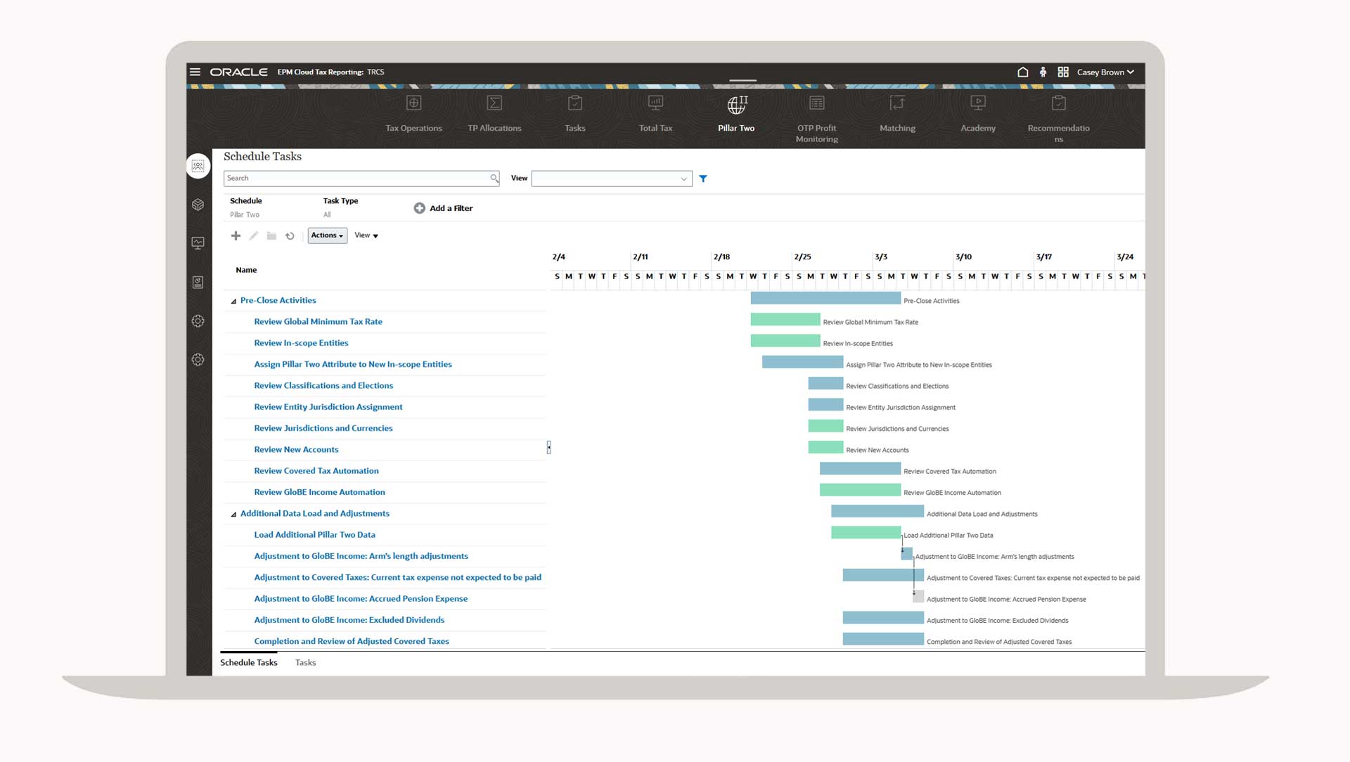 税務、財務、その他の業務分野のシームレスなコラボレーションを実現するために、中央のダッシュボードからタスクを割り当ててモニターできるTask Managerを使用して、新しい要件が企業全体に及ぼす影響を軽減します。さらに、Oracle Cloud EPMは、税務部門、コントローラーの組織、およびFP&Aにまたがる単一の帳簿として機能するため、効率性と正確性が向上します。