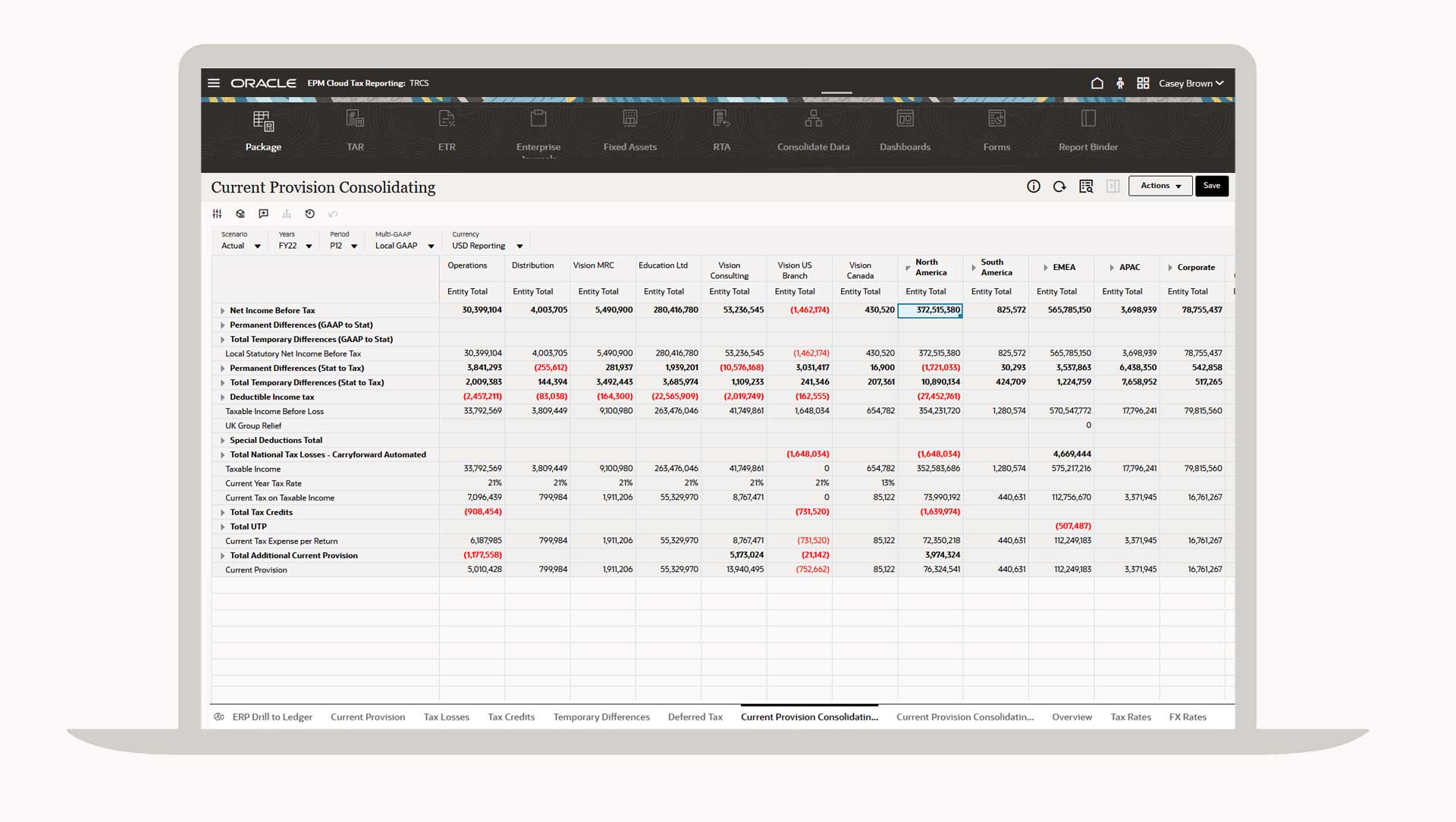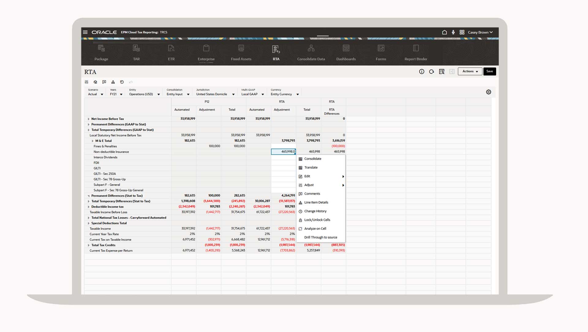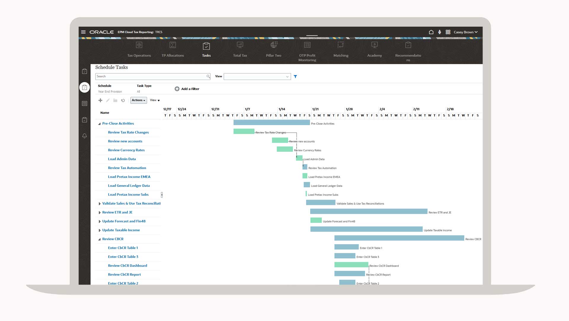 Oracle Cloud EPM Tax Reportingは、税引当、国別報告(CbCR)、およびOECD Pillar2に対応した、すぐに使えるレポート機能を提供します。1つの完全なクラウドEPMプラットフォームで税務プロセスを改善・自動化し、重要な法人税の期限を遵守します。