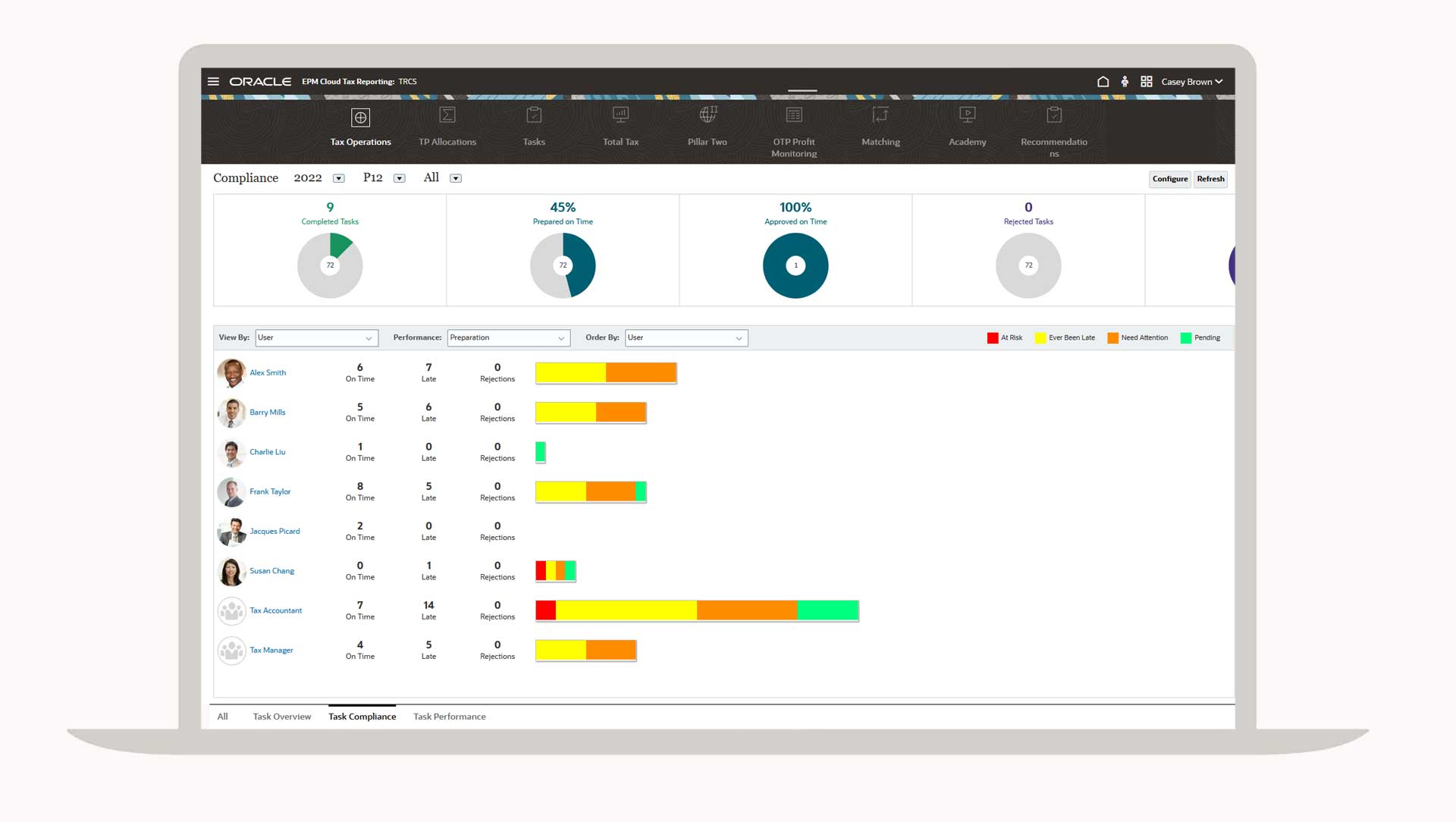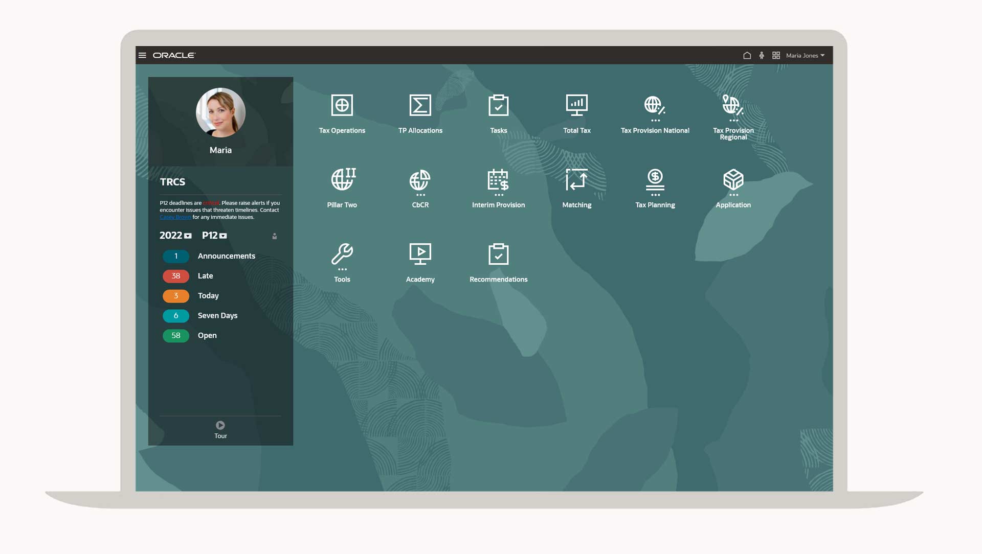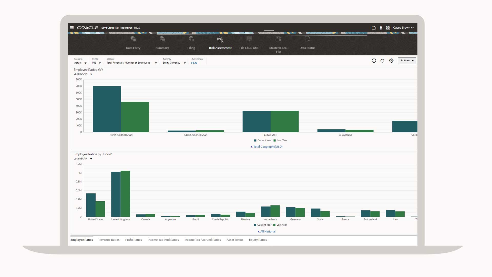 Oracle Cloud EPM Tax Reportingは、税引当、国別報告(CbCR)、およびOECD Pillar2に対応した、すぐに使えるレポート機能を提供します。1つの完全なクラウドEPMプラットフォームで税務プロセスを改善・自動化し、重要な法人税の期限を遵守します。