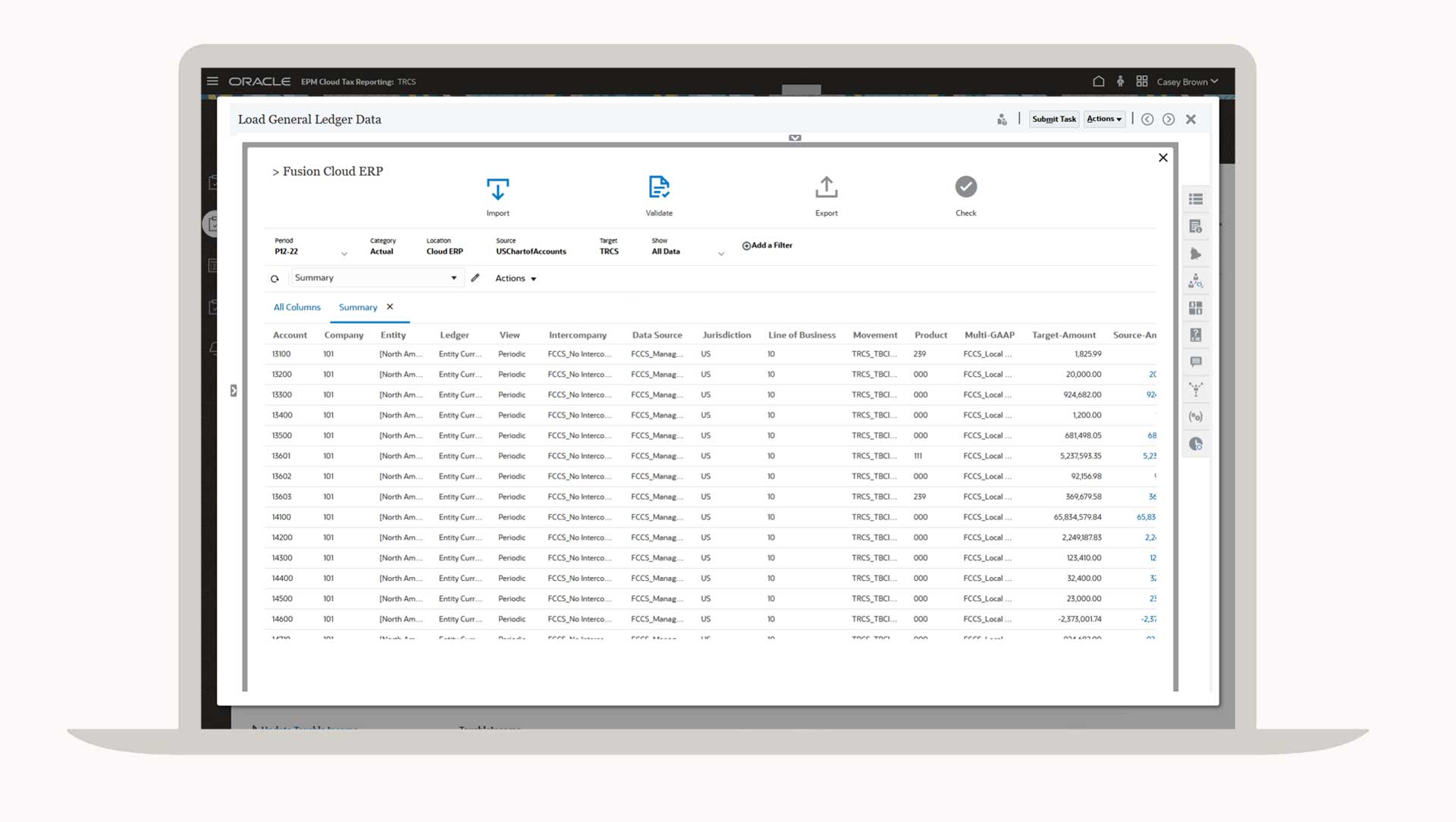 総勘定元帳や財務統合システムから直接財務データにアクセスし、ソースシステムを掘り下げることで、税引当金プロセスを効率化します。税計算では最新のデータが使用されるため、精度と速度が向上します。