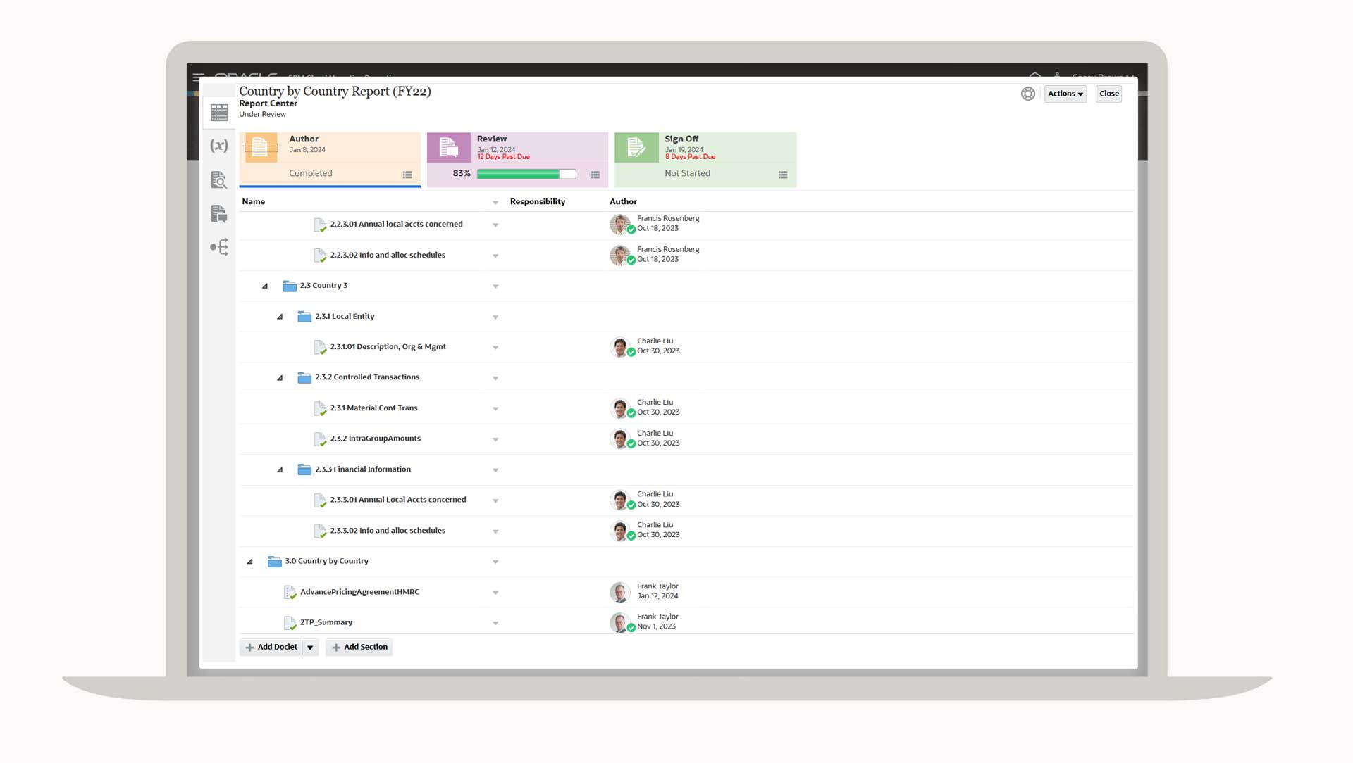 企業税務グループは、税務報告の詳細をOracle Cloud EPMのナラティブ・レポーティングに組み込むことで、世界中のユーザーとマスター・ファイルやローカル・ファイルで共同作業を行うことができます。
