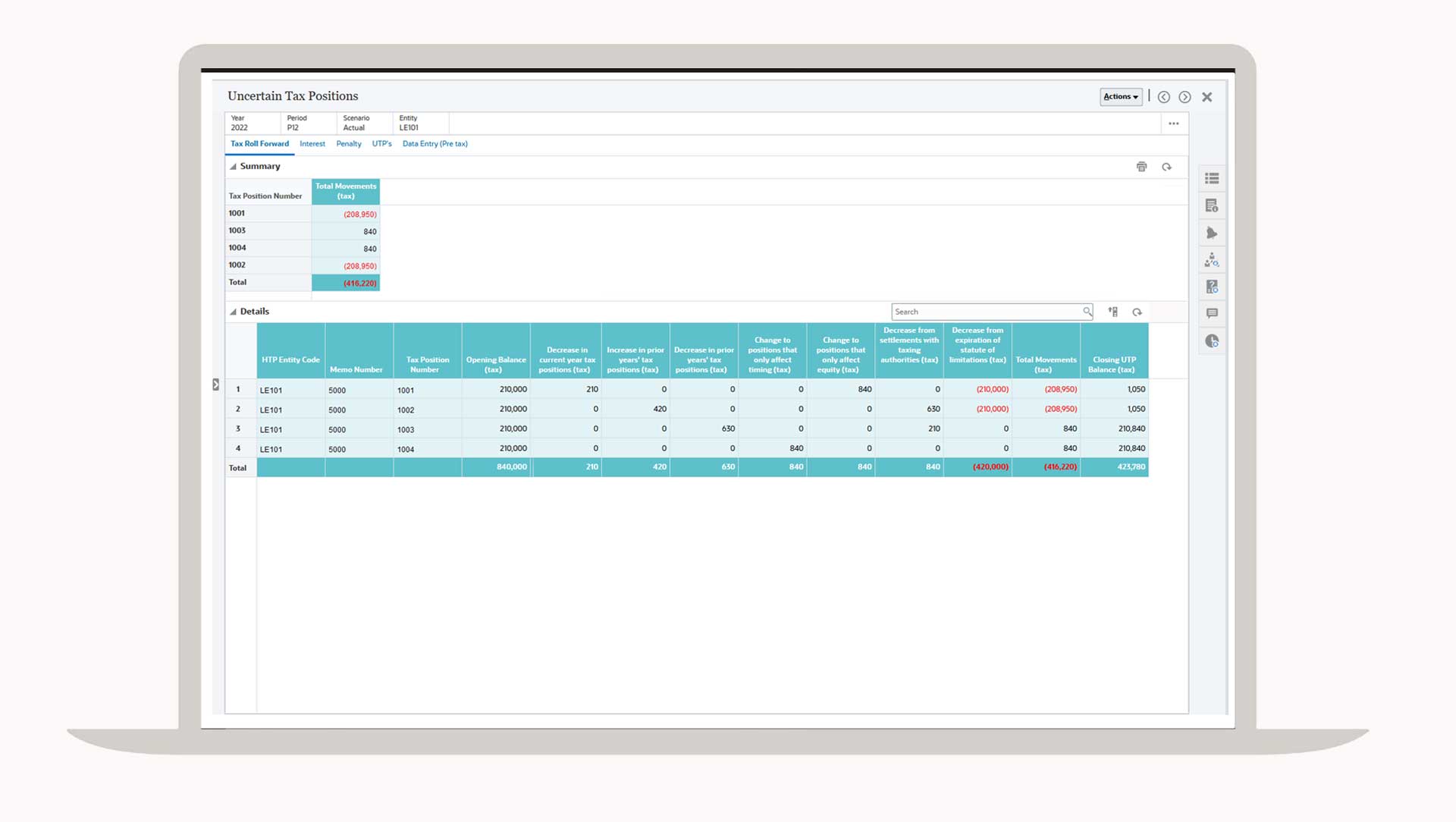 税引当金を計算し、税仕訳を自動的に生成します。税金引当金は、最小レベル(法人または申告グループ)から連結税額開示まで計算されます。これらの計算は、すぐに使用できるUS GAAPおよびIFRS要件に対応しています。