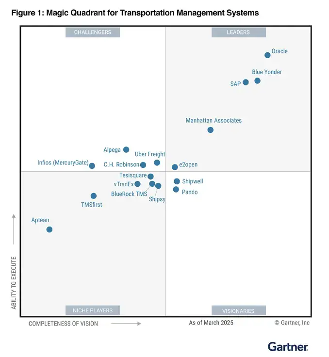 Gartnerは、2006年、2008年、2009年~2012年、2014年~2025年に、Magic Quadrant for Transportation Management Systemsでオラクルをリーダーに選出しています。