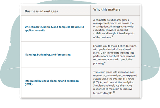 One complete, unified, and complete cloud EPM application suite Limited footprint that’s planning centric. May require custom development or third-party tools for other non-planning EPM business processes.12 Includes solutions for planning, profitability, cost management, financial consolidation and close, account reconciliation, tax reporting, narrative reporting, freeform, and enterprise data management. A complete solution integrates management processes across the organization, aligning strategy with execution. Provides improved visibility and insight into all aspects of the business.3