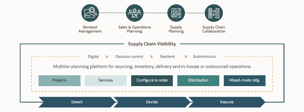 Oracle Supply Chain Planning 是 Oracle Supply Chain Command Center 解決方案的關鍵組成部分。規劃洞察和機器學習模型可推動製造、庫存、運輸和採購行動。預先定義的使用案例可偵測、決定及執行整個供應鏈網路問題的回應。
