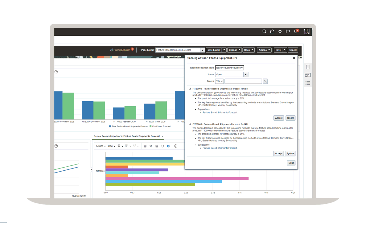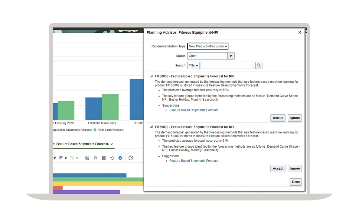 Oracle Demand Management 使用 Bayesian 混合、eXtreme Gradient Boosting 等機器學習技術,能夠更準確地預測需求。該解決方案適用於處理生命週期較短、間歇性、季節性、促銷和配置的專案。它還能自動檢測異常值、填補資料缺口,並調整目標參數,以最小化預測錯誤。